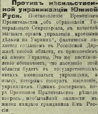 Постановление Временного Правительства «об образовании Генерального Секретариата, в качестве высшего органа управления краевыми делами на Украине», фактически является созданием в Российской Державе особой области, с присвоением ей имени Украины. Это же постановление обозначает, что население этой области будет в государственных актах именоваться украинцами, а язык, которым говорит население, украинским. Одним росчерком пера Временное Правительство решило вопрос необычайной важности в жизни каждого гражданина Юга России.