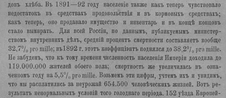 "Возьмем эти цифры, учтем их и увидим, что мы расплатились за неурожай [1891-1892 годов] 654500 человеческих жизней. Вот результат ненормальных условий того голодного периода"