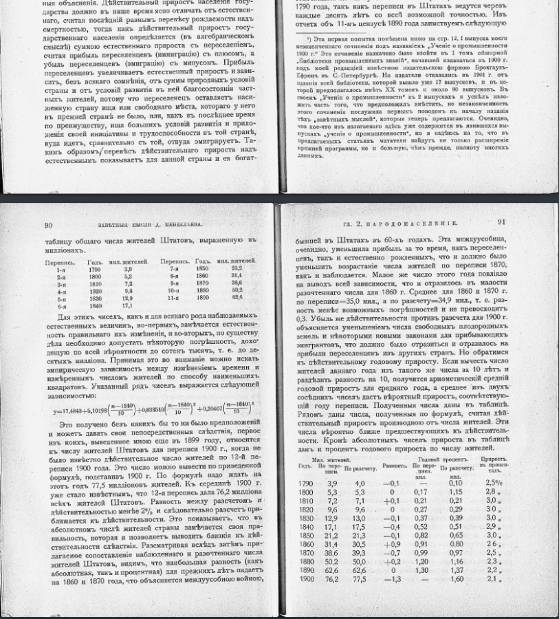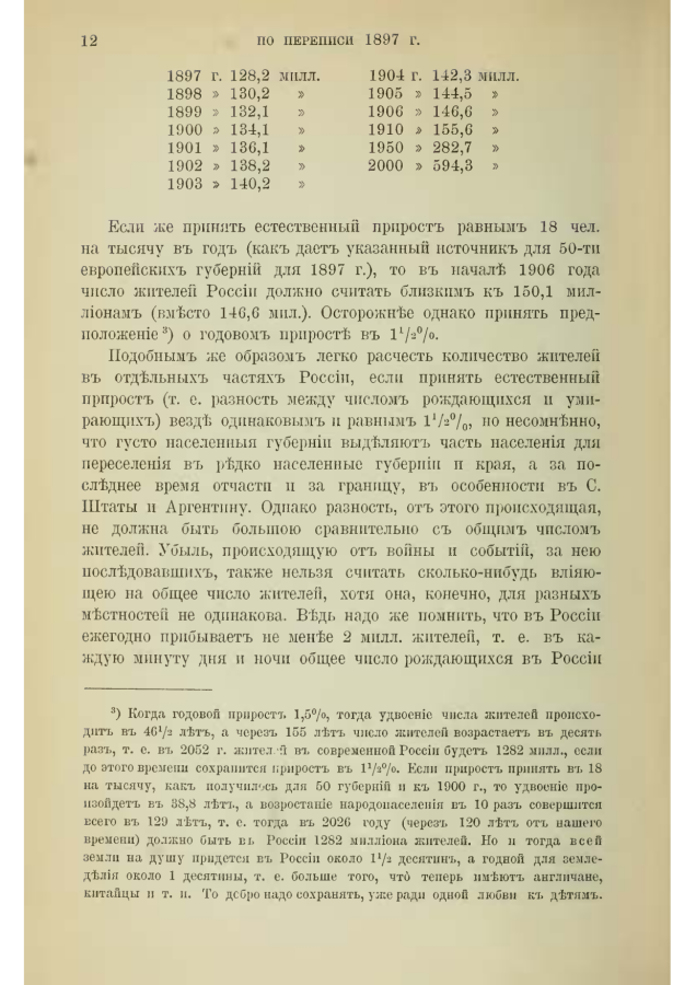 "Для всей же России, взятой как целое, на основании данных, собираемых Центральным Статистическим Комитетом М-ва В.Д. ("Движение населения Европ. России за 1897г.", 1900) о числе рождающихся и умирающих, должно принять прирост никак не менее 15 человек в год на 1000 жителей. Это допущение дает следующее вероятное количество миллионов населения России по годам: 1897 г. — 128,2 млн … 2000 г. — 594,3 млн."