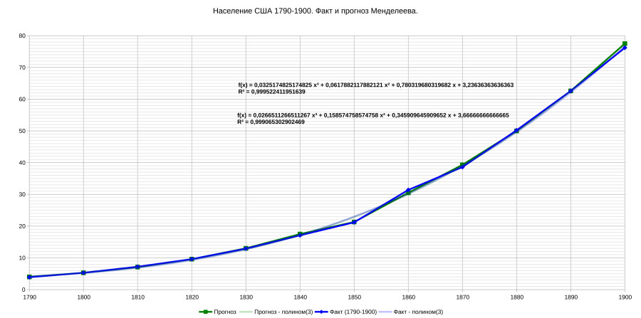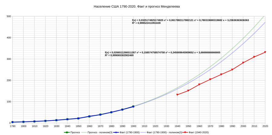 И, что характерно, мои расчёты практически соответствуют написаному Менделеевым чуть дальше: "…к середине XX века, когда число жителей Штатов достигло бы почти до 180 миллионов. Ждать именно этого и должно…" — что намекает на верность моей реконструкции.