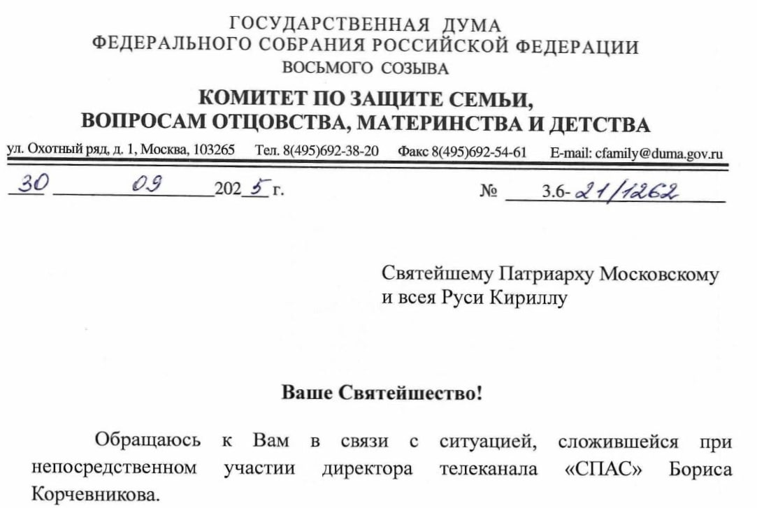 Она направила официальное обращение к патриарху Московскому и всея Руси Кириллу с просьбой "пояснить, насколько позиция, транслируемая в публичное пространство Борисом Корчевниковым, формально возглавляющим миссионерский телеканал РПЦ, совпадает с действительной позицией Русской Православной Церкви".