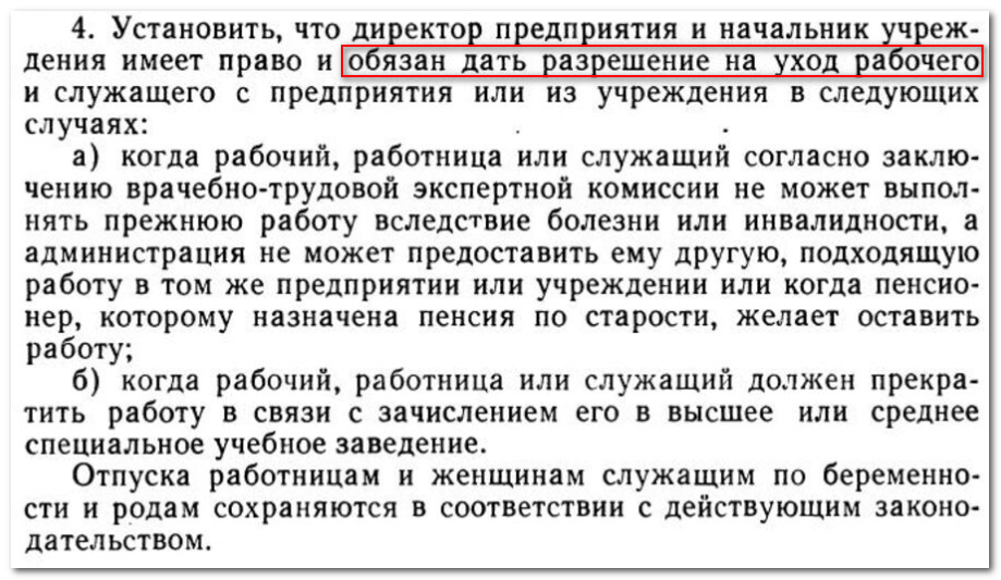 Дескать ну вот, вот же! Железобетонное доказательство принудительного труда в СССР! Это же "советское крепостное право", полный запрет на увольнение и уход с работы! Вот они, ваши большевики, работать заставляли простой народ, принудительно...