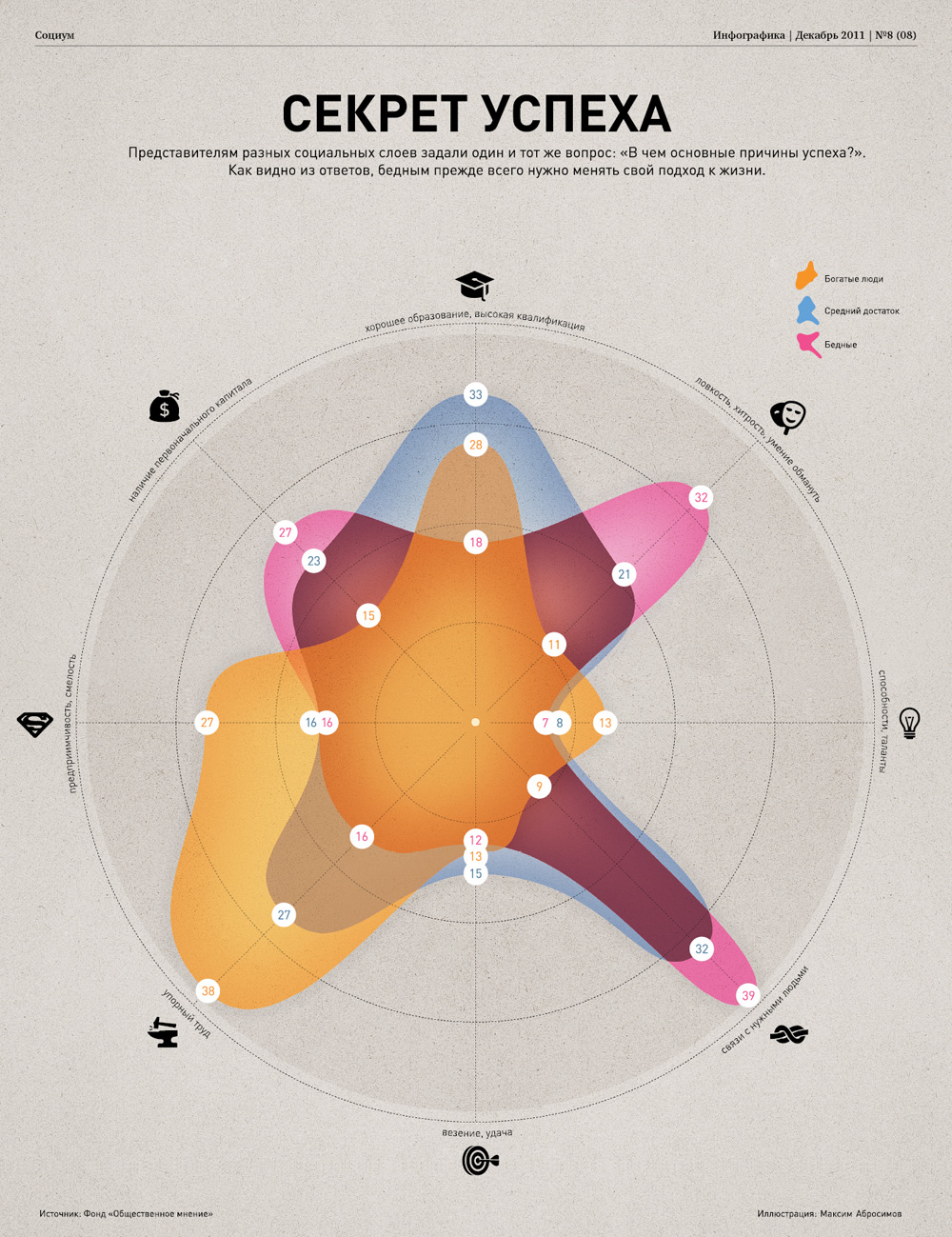 Словом, рисунок этот и предположительно лежащий в его основе опрос никак не позволяет оценить реальные причины успеха. Однако он кочует по Интернету и разные граждане таки навязывают при помощи него подобную оценку. Причем, что характерно: как бедные, так и богатые, очевидно, при ответах на вопросы могут лгать, заблуждаться, неосознанно приукрашивать ситуацию в свою пользу, принимать желаемое за действительное и т.п. Однако многочисленные интерпретаторы оставляют такую возможность только за бедными, слова же богатых принимают за отражение объективной реальности.