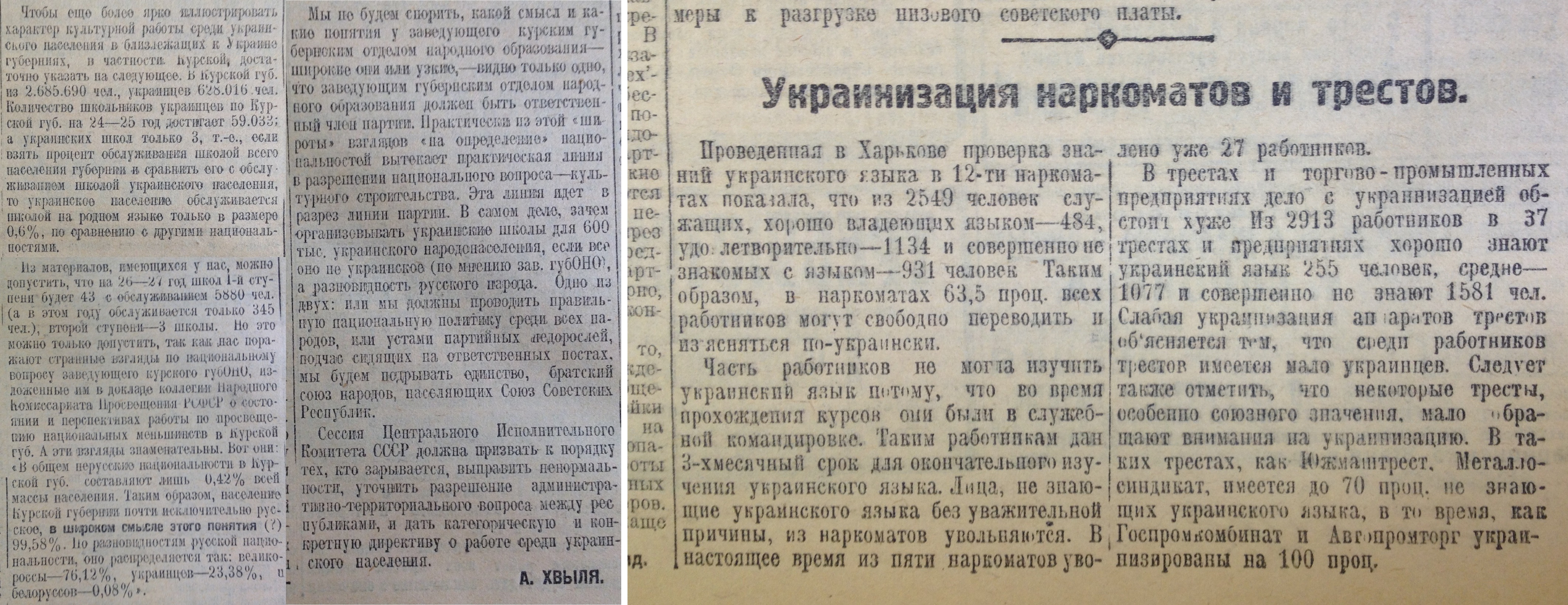 - "...вместо правильного большевистского проведения национальной политики в ряде районов Украины, украинизация проводилась механически, без учета конкретных особенностей каждого района, без тщательного подбора большевистских украинских кадров, что облегчило буржуазно-националистическим элементам, петлюровцам и проч. создание своих легальных прикрытий, своих контрреволюционных ячеек и организаций",