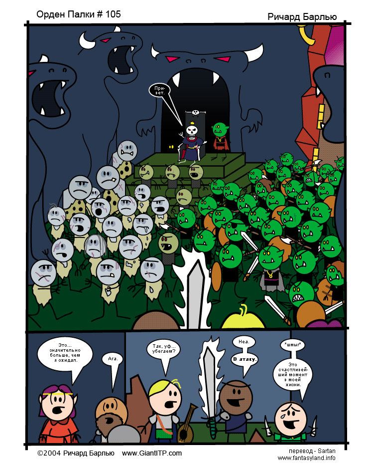Вскоре, когда становится ясно, что связь с клириком потеряна, обращаются к партийному магу, который в экспедиции не участвовал, поскольку наводил порядок в новообретенной башне. Маг безо всякой задней мысли протирает тряпочкой новенький хрустальный шар и обращается к нему с вопросом: "хочу увидеть, что убило нашего клирика". Занавес.