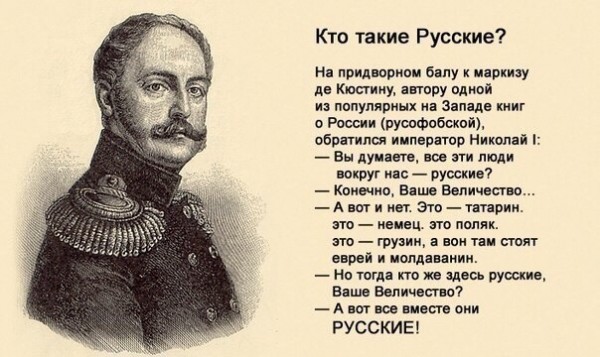 «Император Николай, подойдя ко мне, с улыбкой спросил, показывая на присутствующих: "Вы, вероятнее всего, думаете, что находитесь среди русских, но вы ошибаетесь: вот немец, там поляк, тут армянин, вон грузин, там, подальше, — татарин, здесь — финляндец, а все это вместе и есть Россия» — маркиз Астольф де Кюстин, «Россия в 1839 году».