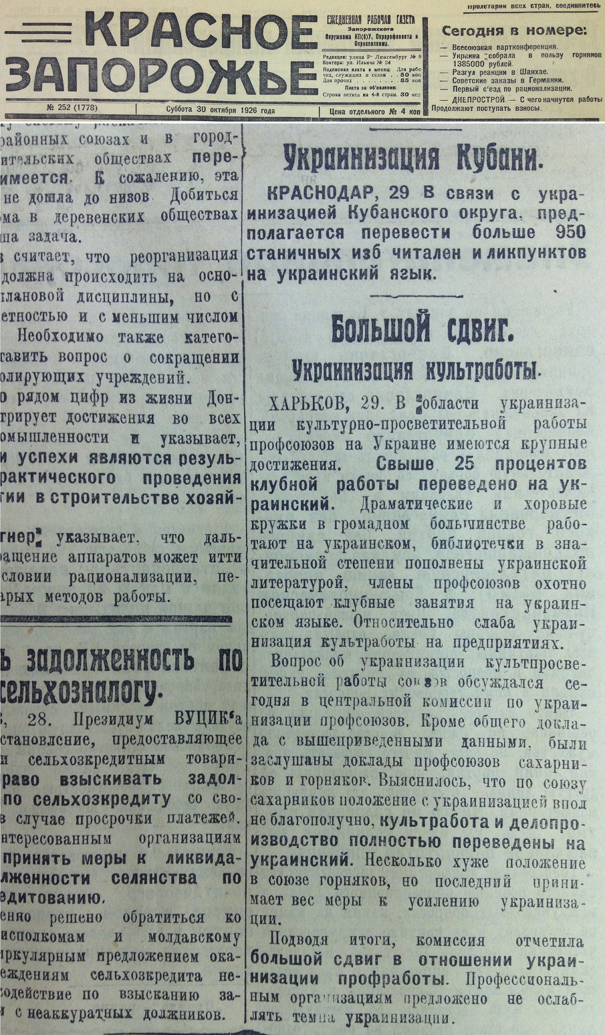 - агрессивная тотальная украинизация стартовала в 1925 году, когда пост Генсека ЦК КП(б)У занял верный сталинец товарищ Каганович (ранее при его предшественнике Квиринге украинизация проводилась в вялотекущем режиме без резких движений) и начались массовые увольнения и уголовные преследования противников украинизации, что и отражено в газетных материалах