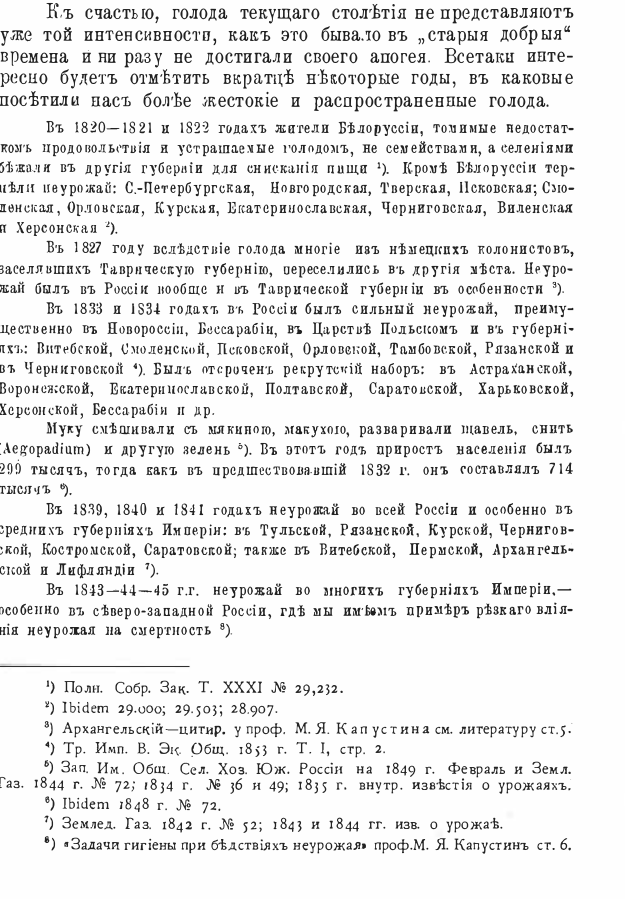 "К счастью, голода текущего столетия не представляют уже той интенсивности, как это бывало в "старые добрые" времена и ни разу не достигали своего апогея. Все-таки интересно будет отметить вкратце некоторые годы, в каковые посетили нас более жестокие и распространенные голода.