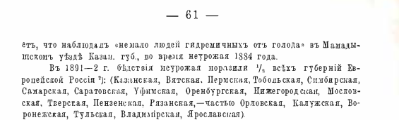 В 1891-2 г. бедствия неурожая поразили ⅓ всех губерний Европейской России: Казанская, Вятская, Пермская, Тобольская, Симбирская, Самарская, Саратовская, Уфимская, Оренбургская, Нижегородская, Московская, Тверская, Пензенская, Рязанская, частью Орловская, Калужская, Воронежская, Тульская, Владимирская, Ярославская."