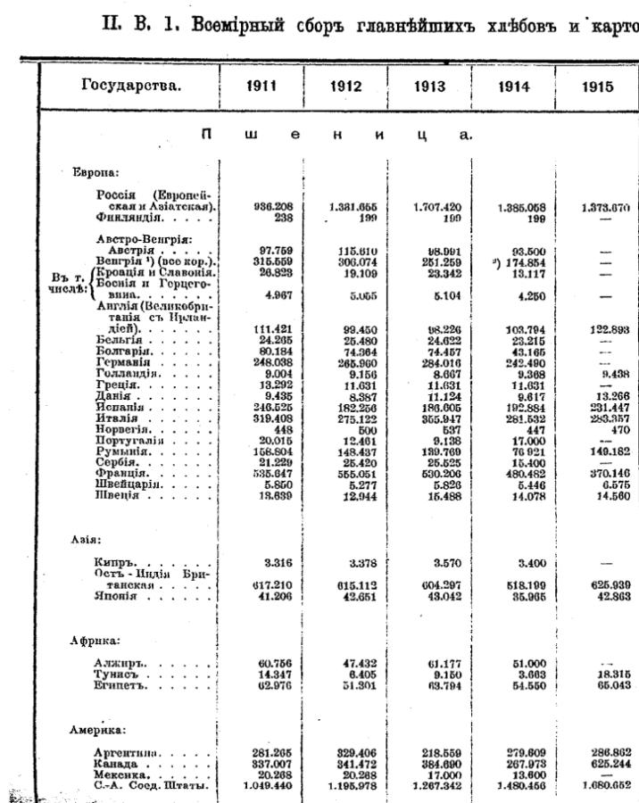 С. 114-118. Всемирный сбор главнейших хлебов и картофеля за период 1911-1915 г.г. (тыс. пуд.). Пшеница, 1911 год.