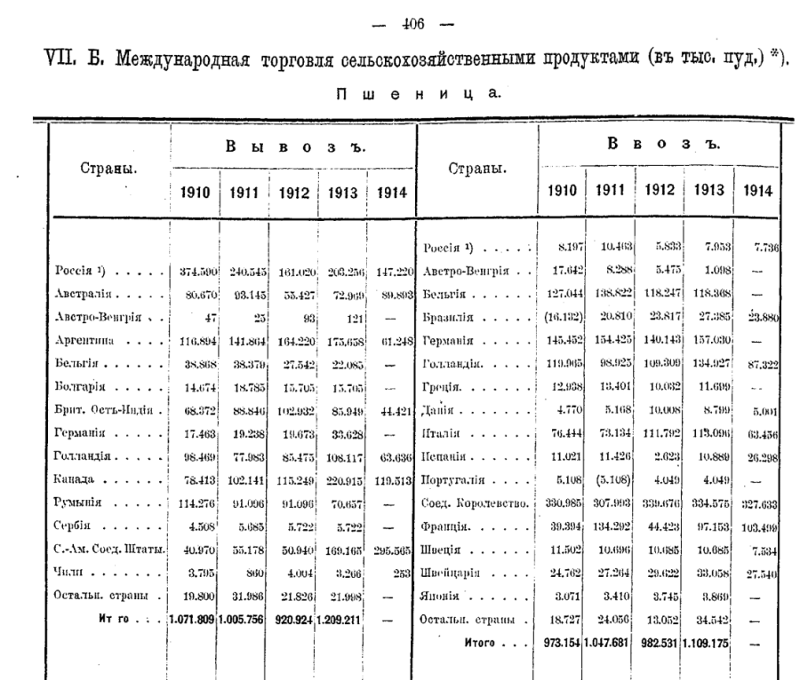 С. 406-414. Международная торговля сельскохозяйственными продуктами. (тыс. пуд.). Пшеница, 1911 год.