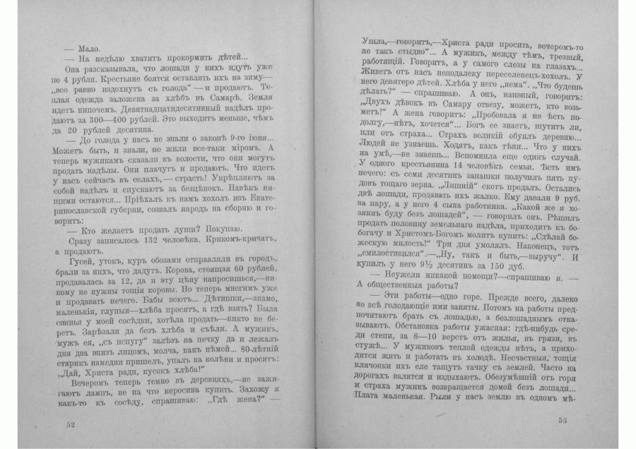 "Она рассказывала, что лошади у них идут уже по 4 рубля. Крестьяне боятся оставлять их на зиму — "все равно издохнут с голода" — и продают. Теплая одежда заложена за хлеб в Самаре. Земля идет нипочем. Девятнадцатидесятинный надел продают за 300-400 рублей. Это выходить меньше, чем да 20 рублей десятина. — До голода у нас не знали о законе 9-го июня...Может быть и знали, но жили все-таки миром. А теперь мужикам сказали в волости, что они могут продать наделы. Они плачут и продают. Что идет у нас сейчас в селах, — страсть! Укрепляют за собой надел и спускают за безценок. Навек нищими остаются... Приехал к нам хохол из Екатеринославской губернии, созвал народ на сборню и говорит:— Кто желает продать души? Покупаю. Сразу записалось 132 человека. Криком-кричат,а продают.