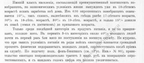 "Низший класс населения, составляющий преимущественный контингент новобранцев, по экономическим условиям жизни вынужден уже в 18-летнем возрасте искать заработка вне дома. Из 630 опрошенных новобранцев оказывается 25%, так сказать, вылетевших из гнезда ранее 17 летнего возраста, 30% в 18-летнем возрасте, 30% в 19-летнем возрасте, и только 15% дожили в семье (семьи с достатком) до призывного возраста.
