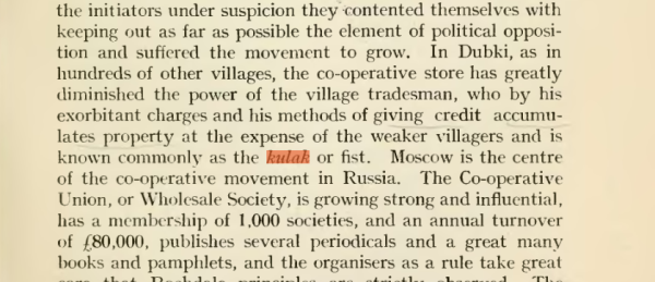 "In Dubki, as in hundreds of other villages, the co-operative store has greatly diminished the power of the village tradesman, who by his exorbitant charges and his methods of giving credit accumulates property at the expense of the weaker villagers and is known commonly as the kulak or fist."