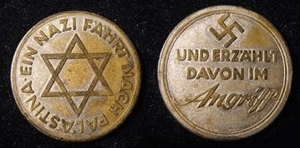 Отчеканена она по распоряжению Геббельса как оценка писательского труда барона Леопольда Иц Эдлера фон Мильденштайна, посетившего в 1933 году несколько еврейских поселений в Палестине, о чем и написал в серии статей, напечатанных в издаваемом Йозефом Геббельсом журнале «Ангриф» («Наступление»). Назывался труд «Путешествие национал-социалиста в Палестину». В то время сионисты и нацисты Рейха по сути сотрудничали: сионисты хотели массово переселить евреев в Палестину, а гитлеристы считали эту идею просто превосходной с т.з. "да пожалуйства, лишь бы из Германии".