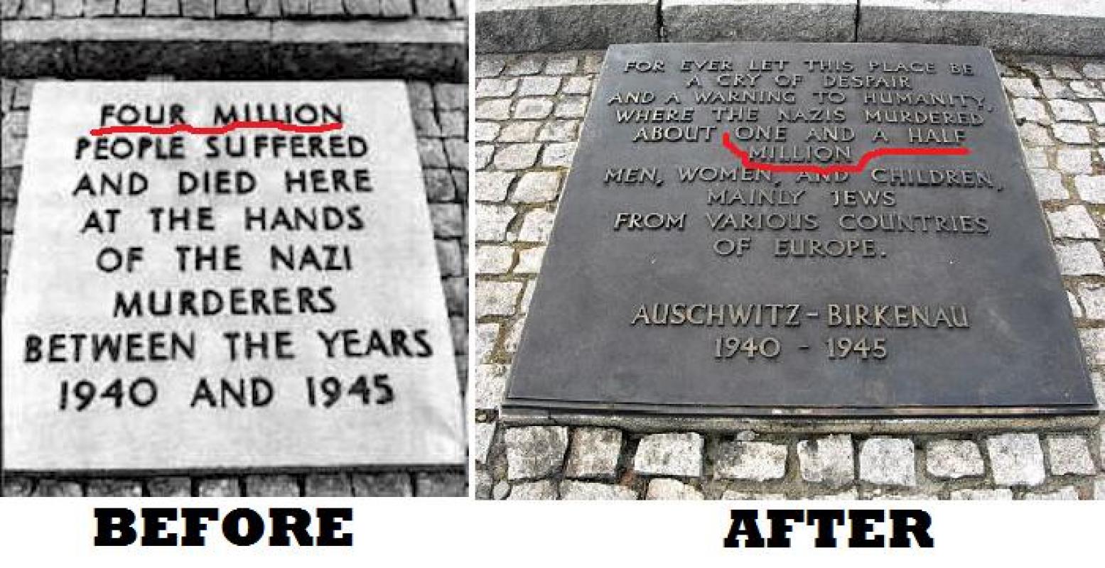 Кстати, полезная информация к размышлению. Слышали про концепцию т.н. холокоста? Мол, в Третьем Рейхе убили 6 млн евреев, причём лишь за то, что евреи, в промышленных масштабах и задействуя газовые камеры и крематории вопреки естественнонаучным законам. Тема интересная и обширная, но просто один факт. В эти шесть миллионов, понятно дело, включались погибшие в Освенциме. Там вот, изначально там висела табличка про 4 млн погибших, но потом, если не ошибаюсь, то в 1993, она была заменена на 1,5 млн: