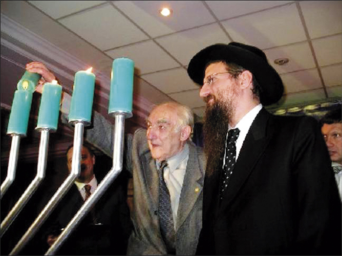 При этом, несмотря на советскость, многие евреи стремились свою еврейскость поддерживать. Вот, скажем, Нобелевский лауреат по физике академик РАН Виталий Лазаревич Гинзбург зажигает менору в синагоге.