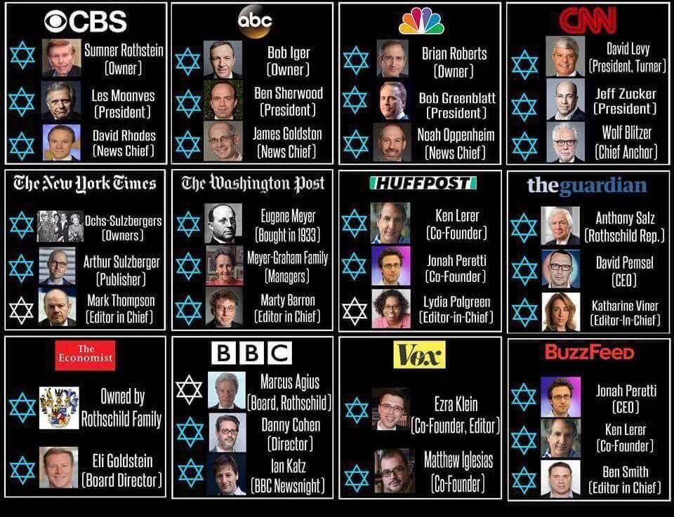 Нижеследующие иллюстрации, если честно, по персоналиям не проверял; но там и по фамилиям у многих видно. И даже если вдруг половина внесена ошибочно, то евреев в США менее 3%, сравните пропорциональность, особенно на примере медиа (в правительстве-то фиг его знает, сколько всего человек).