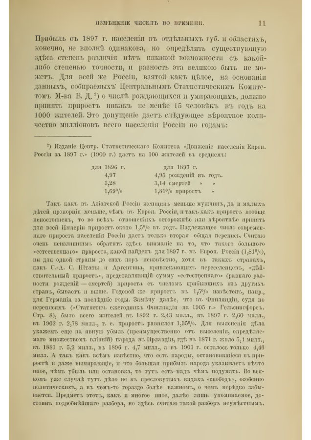 "Для всей же России, взятой как целое, на основании данных, собираемых Центральным Статистическим Комитетом М-ва В.Д. ("Движение населения Европ. России за 1897г.", 1900) о числе рождающихся и умирающих, должно принять прирост никак не менее 15 человек в год на 1000 жителей. Это допущение дает следующее вероятное количество миллионов населения России по годам: 1897 г. — 128,2 млн … 2000 г. — 594,3 млн."