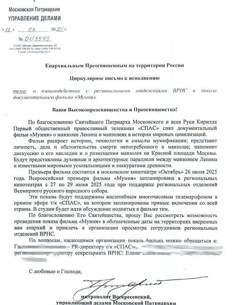 "Авторы фильма «Мумия», вышедшего на телеканале «СПАС», не выражают официальную позицию Церкви, которая никогда не выступала с требованием вынести В.И.Ленина из мавзолея, однако его квази-религиозное почитание, которое ассоциируется с его захоронением в мавзолее, разумеется, несовместимо с православным вероучением. Об этом Церковь обязана свидетельствовать в том числе и перед теми , кто с глубоким уважением относится к памяти этого исторического деятеля."