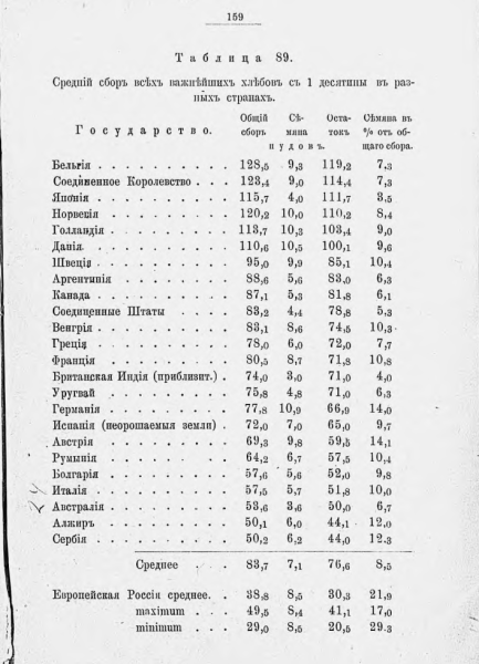 С. 159-160 (Средний сбор всех важнейших хлебов с 1 десятины в разных странах):
