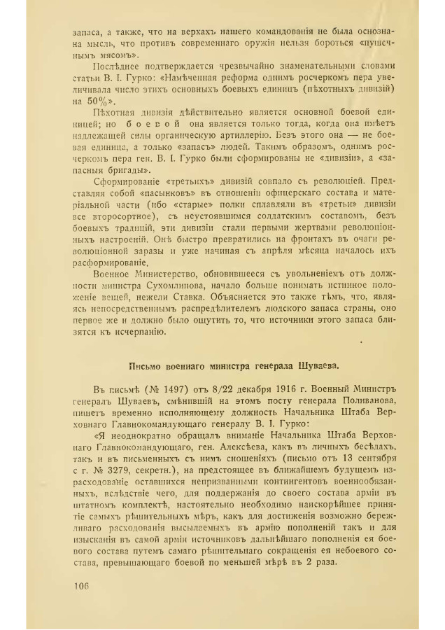 Читая ответ генерала Гурко, нельзя не видеть, что Ставка прикладывает к России масштаб, приложимый к несравненно более развитым в культурном и экономическом отношениях западноевропейским государствам. В ошибочности оценки Ставкой российских возможностей можно убедиться из следующего факта. Одновременно с рассматриваемой нами перепиской, Ставка разрабатывает вопрос о формировании так называемых «третьих дивизий»; путем превращения пехотных полков из 4-батальонных в 3-батальонные и с добавлением лишних 4 батальонов на каждые две дивизии, создавалась совершенно новая пехотная дивизия. Нужную для этих «третьих» дивизий материальную часть и пехотное вооружение предполагалось достать, обобрав и без того бедные в этом отношении существующие пехотные дивизии и полки. Таким образом, Ставка шла по совершенно иному пути, чем тот, на который совершенно правильно указывала вышеприводимая записка членов Гос. Думы и Государственного Совета: «Заменить энергию, заключающуюся в человеческой крови, силой свинца, стали и взрывчатых веществ».