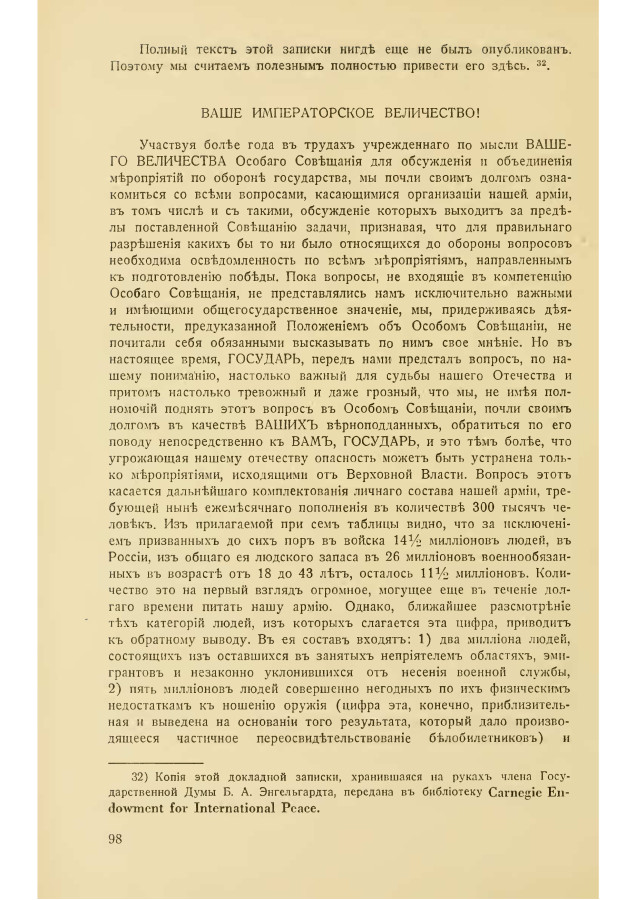 Участвуя боле года в трудах учрежденного по мысли ВАШЕГО ВЕЛИЧЕСТВА Особого Совещания для обсуждения и объединения мероприятий по обороне государства, мы почли своим долгом ознакомиться со всеми вопросами, касающимися организации нашей армии, в том числе и с такими, обсуждение которых выходит за пределы поставленной Совещанию задачи, признавая, что для правильного разрешения каких бы то ни было относящихся до обороны вопросов необходима осведомленность по всем мероприятиям, направленным к подготовлению победы. Пока вопросы, не входящие в компетенцию Особого Совещания, не представлялись нам исключительно важными и имеющими общегосударственное значение, мы, придерживаясь деятельности, предуказанной Положением об Особом Совещании, не почитали себя обязанными высказывать по ним свое мнение. Но в настоящее время, ГОСУДАРЬ, перед нами предстал вопрос, по нашему пониманию, настолько важный для судьбы нашего Отечества и притом настолько тревожный и даже грозный, что мы, не имея полномочий поднять этот вопрос в Особом Совещании, почли своим долгом в качеств ВАШИХ верноподданных, обратиться по его поводу непосредственно к ВАМ, ГОСУДАРЬ, и это тем более, что угрожающая нашему отечеству опасность может быт устранена только мероприятиями, исходящими от Верховной Власти. Вопрос этот касается дальнейшего комплектования личного состава нашей армии, требующей ныне ежемесячного пополнения в количеств 300 тысяч человек. Из прилагаемой при сем таблицы видно, что за исключением призванных до сих пор в войска 14½ миллионов людей, в России, из общего её людского запаса в 26 миллионов военнообязанных в возраст от 18 до 43 лет, осталось 11½ миллионов. Количество это на первый взгляд огромное, могущее еще в течение долгого времени питать нашу армию. Однако, ближайшее рассмотрение тех категорий людей, из которых слагается эта цифра, приводить к обратному выводу. В её состав входят: 1) два миллиона людей, состоящих из оставшихся в занятых неприятелем областях, эмигрантов и незаконно уклонившихся от несения военной службы, 2) пять миллионов людей совершенно негодных по их физическим недостаткам к ношению оружия (цифра эта, конечно, приблизительная и выведена на основании того результата, который дало производящееся частичное переосвидетельствование белобилетников) и 3) три миллиона людей, не могущих быт взятыми из страны, так как они составляют то минимальное число работоспособных лиц мужского пола, которое необходимо для деятельности промышленности, работающей на оборону, обслуживая железнодорожного движения и обеспечения личного состава различных отраслей государственного управления.