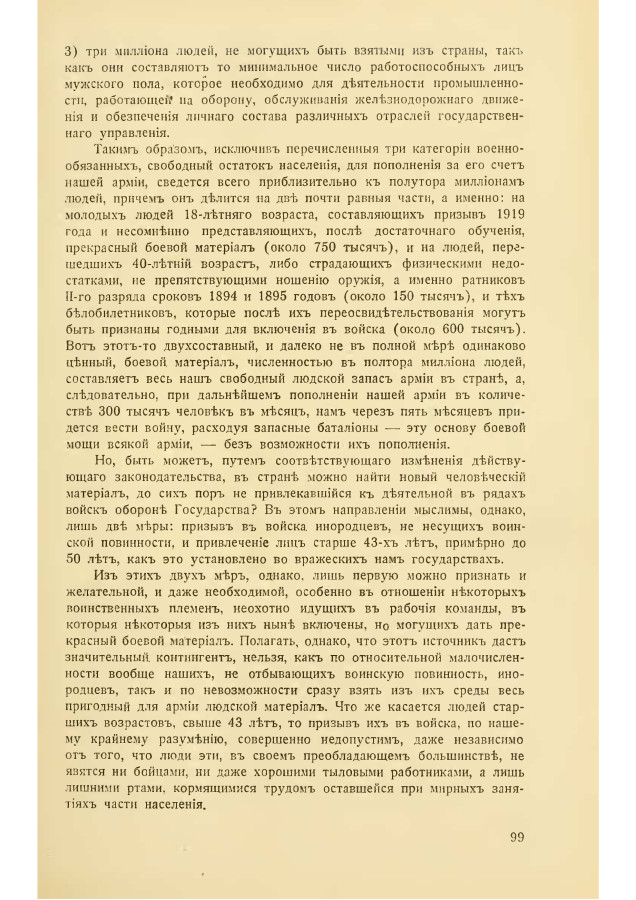 Таким образом, исключив перечисленные три категории военнообязанных, свободный остаток населения, для пополнения за его счет нашей армии, сведется всего приблизительно к полутора миллионам людей, причем он делится на две почти равные части, а именно: на молодых людей 18-летнего возраста, составляющих призыв 1919 года и несомненно представляющих, после достаточного обучения, прекрасный боевой материал (около 750 тысяч), и на людей, перешедших 40-лет возраст, либо страдающих физическими недостатками, не препятствующими ношению оружия, а именно ратников I-го разряда сроков 1894 и 1895 годов (около 150 тысяч), и тех белобилетников, которые после их переосвидетельствования могут быт признаны годными для включен в войска (около 600 тысяч). Вот этот-то двухсоставный, и далеко не в полной мере одинаково ценный, боевой материал, численностью в полтора миллиона людей, составляет весь наш свободный людской запас армии в стране, а, следовательно, при дальнейшем пополнении нашей армии в количеств 300 тысяч человек в месяц, нам через пять месяцев придется вести войну, расходуя запасные батальоны — эту основу боевой мощи всякой армии, — без возможности их пополнения.