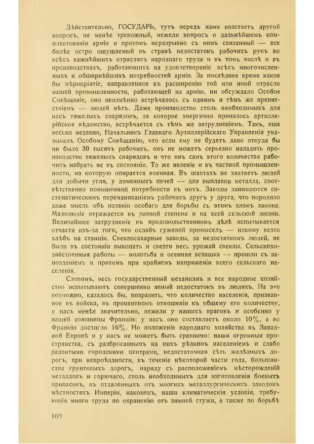 Действительно, ГОСУДАРЬ, тут перед нами восстает другой вопрос, не менее тревожный, нежели вопрос о дальнейшем комплектовании армии и притом неразрывно с ним связанный — все более остро ощущаемый в стране недостаток рабочих рук во всех важнейших отраслях народного труда и в том числе и в производствах, работающих на удовлетворение всех многочисленных и обширнейших потребностей армии. За последнее время какое бы мероприятие, направленное к расширению той или иной отрасли нашей промышленности, работающей на армию, ни обсуждало Особое Совещание, оно неизменно встречалось с одним и тем же препятствием — людей нет. Даже производство столь необходимых для нас тяжелых снарядов, за которое энергично принялось артиллерийское ведомство, встречается с тем же затруднением. Так, еще весьма недавно, Начальник Главного Артиллерийского Управления указывал Особому Совещанию, что если ему не будет дано откуда бы ни было 30 тысяч рабочих, он не может серьезно наладить производство тяжелых снарядов и что он сам этого количества рабочих набрать не в состоянии. То же явление и в частной промышленности, на которую опирается военная. В шахтах не хватает людей для добычи угля, у доменных печей — для выплавки металла, соответственно повышенной потребности в них. Заводы занимаются систематическим переманиванием рабочих друг у друга, что породило даже мысль об издании особого для борьбы с этим злом закона. Малолюдие отражается в равной степени и на всей сельской жизни. Величайшее затруднение в продовольственном деле испытывается отчасти из-за того, что ослаб гужевой промысел — некому везти хлеб на станции. Свеклосахарные заводы, за недостатком людей, не были в состоянии выкопать и свезти весь урожай свеклы. Сельскохозяйственные работы — молотьба и осенняя вспашка — прошли с запозданием и притом при крайнем напряжении всего сельского населения.