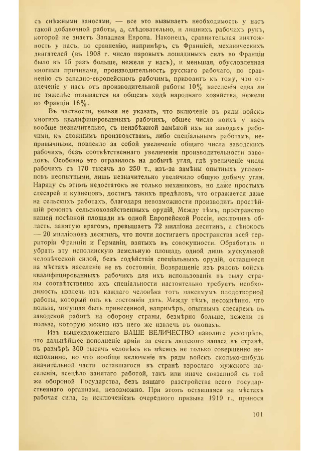 В частности, нельзя не указать, что включение в ряды войск многих квалифицированных рабочих, общее число коих у нас вообще незначительно, с неизбежной заменой их на заводах рабочими, к сложным производствам, либо специальным работам, непривычными, повлекло за собой увеличение общего числа заводских рабочих, без соответственного увеличения производительности заводов. Особенно это отразилось на добыче угля, где увеличение числа рабочих с 170 тысяч до 250 т., из-за замены опытных углекопов неопытными, лишь незначительно увеличило общую добычу угля. Наряду с этим недостаток не только механиков, но даже простых слесарей и кузнецов, достиг таких пределов, что отражается даже на сельских работах, благодаря невозможности производить простейший ремонт сельскохозяйственных орудий, Между тем, пространство нашей посевной площади в одной Европейской России, исключив область, занятую врагом, превышает 72 миллиона десятин, а сенокос — 20 миллионов десятин, что почти достигает пространства всей территории Франции и Германии, взятых в совокупности. Обработать и убрать эту исполинскую земельную площадь одной лишь мускульной человеческой силой, без содействия специальных орудий, оставшееся на местах население не в состоянии. Возвращение из рядов войск квалифицированных рабочих для их использования в тылу страны соответственно их специальности настоятельно требует необходимость извлечь из каждого человека тот максимум плодотворной работы, который он в состоянии дать. Между тем, несомненно, что польза, могущая быт принесенной, например, опытным слесарем в заводской работ на оборону страны, безмерно больше, нежели та польза, которую можно из него же извлечь в окопах.