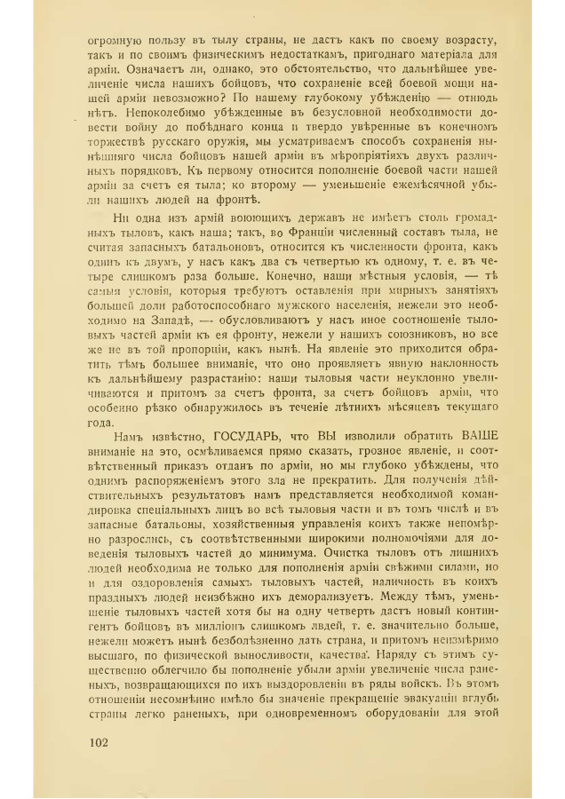 Из вышеизложенного ВАШЕ ВЕЛИЧЕСТВО изволите усмотреть, что дальнейшее пополнение армии за счет людского запаса в стране, в размер 300 тысяч человек в месяц не только совершенно неисполнимо, но что вообще включение в ряды войск сколько-нибудь значительной части оставшегося в стране взрослого мужского населения, всецело занятого работой, так или иначе связанной с той же обороной Государства, без вящего расстройства всего государственного организма, невозможно. При этом оставшаяся на местах рабочая сила, за исключавшем очередного призыва 1919 г., принося огромную пользу в тылу страны, не даст как по своему возрасту, так и по своим физическим недостаткам, пригодного материала для армии. Означает ли, однако, это обстоятельство, что дальнейшее увеличение числа наших бойцов, что сохранение всей боевой мощи нашей армии невозможно? По нашему глубокому убеждению — отнюдь нет. Непоколебимо убежденные в безусловной необходимости довести войну до победного конца и твердо уверенные в конечном торжеств русского оружия, мы усматриваем способ сохранения нынешнего числа бойцов нашей армии в мероприятиях двух различных порядков. К первому относится пополнение боевой части нашей армии за счет ее тыла; ко второму — уменьшение ежемесячной убыли наших людей на фронте.