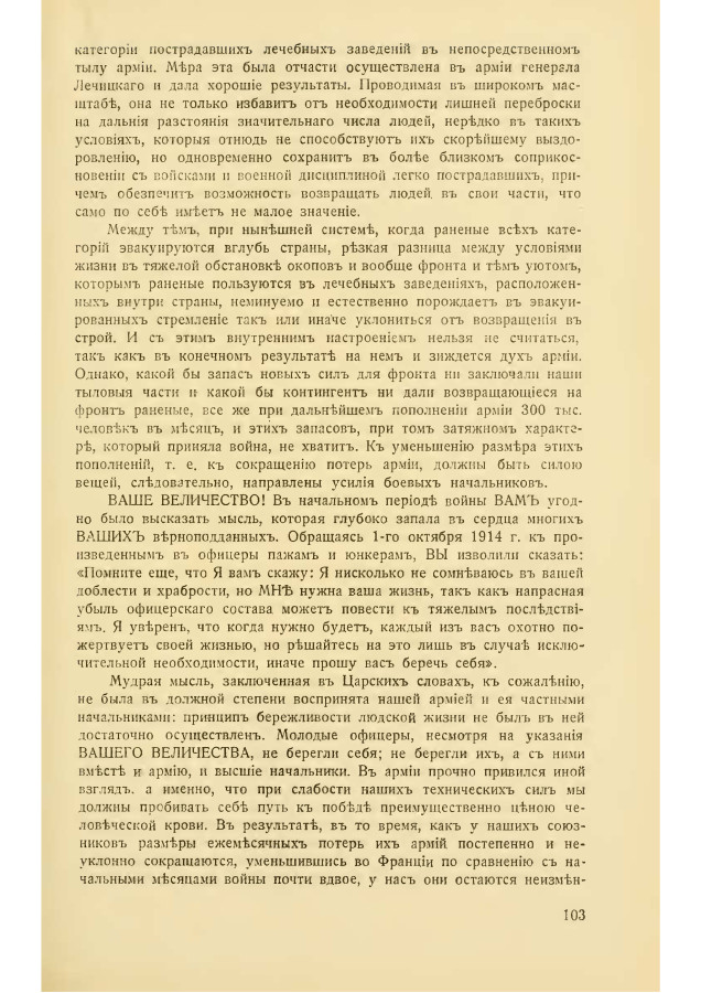 Мудрая мысль, заключенная в Царских словах, к сожалению, не была в должной степени воспринята нашей армией и её частными начальниками: принцип бережливости людской жизни не был в ней достаточно осуществлен. Молодые офицеры, несмотря на указания ВАШЕГО ВЕЛИЧЕСТВА, не берегли себя; не берегли их, а с ними вместе и армию, и высшие начальники. В армии прочно привился иной взгляд, а именно, что при слабости наших технических сил мы должны пробивать себе путь к победе преимущественно ценою человеческой крови. В результате, в то время, как у наших союзников размеры ежемесячных потери их армий постепенно и неуклонно сокращаются, уменьшившись во Франции по сравнению с начальными месяцами войны почти вдвое, у нас они остаются неизменными и даже обнаруживается склонность к их увеличению. Настоятельно необходимо внушить всем начальствующим чинам, что легкое расходование людской жизни, независимо от чисто гуманитарных соображений, недопустимо потому, что человеческий запас у нас далеко не неистощим. Это необходимо не только для сохранения всей боевой мощи нашей армии до победоносного окончания войны, но и для обеспечения работ тыла, при дезорганизации которого потребности армии невозможно будет удовлетворить.