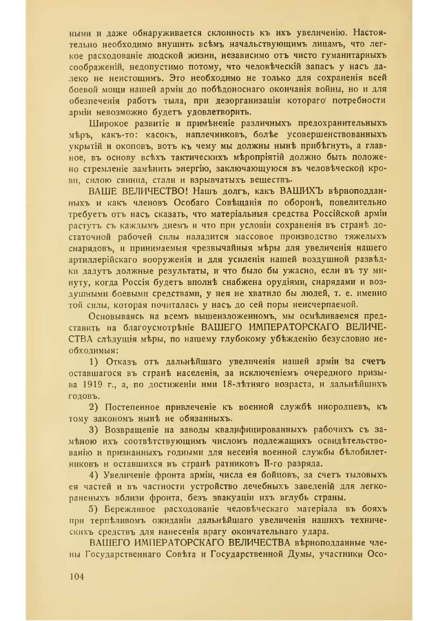ВАШЕ ВЕЛИЧЕСТВО! Наш долг, как ВАШИХ верноподданных и как членов Особого Совещания по обороне, повелительно требует от нас сказать, что материальные средства Российской армии растут с каждым днем и что при условии сохранения в стране достаточной рабочей силы наладится массовое производство тяжелых снарядов, и принимаемые чрезвычайные меры для увеличения нашего артиллерийского вооружения и для усиления нашей воздушной разведки дадут должные результаты, и что было бы ужасно, если в ту минуту, когда Россия будет вполне снабжена орудиями, снарядами и воздушными боевыми средствами, у ней не хватило бы людей, т. е. именно той силы, которая почиталась у нас до сей поры неисчерпаемой.