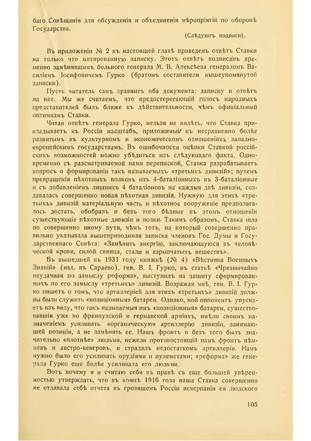 В приложении № 2 к настоящей глав приведен ответ Ставки на только что цитированную записку. Этот ответ подписан временно заменявшим больного генерала М. В. Алексеева генералом Василием Иосифовичем Гурко (братом составителя вышеупомянутой записки).