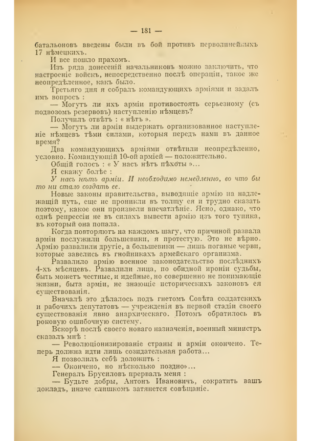 Когда повторяют на каждом шагу, что причиной развала армии послужили большевики, я протестую. Это не верно. Армию развалили другие, а большевики — лишь поганые черви, которые завелись в гнойниках армейского организма.