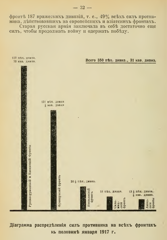 Но на страницах 31-32 этот клоун, ничтоже сумняшеся, заявляет: "Наши союзники не смеют забывать ни на минуту, что к середине января 1917 года эта армия удерживала на своем фронте 187 вражеских дивизий, т.е., 49% всех сил противника, действовавших на европейских и азиатских фронтах. Старая русская армия заключала в себе достаточно сил, чтобы продолжать войну и одержать победу." Речь идёт, конечно, только о пехотных и кавалерийских дивизиях — так "статистика" внушительне выглядит.