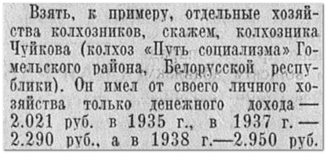На самом деле колхозник Чуйков, о котором пишет газета в 1939 году, был приведен тов. Кулагиным в качестве примера, при обсуждении введения того самого прогрессивного налога на доход с личных подворий, о котором упомянул читатель в своем вопросе.