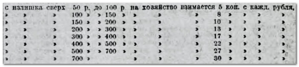 А вот далее, в зависимости от дохода, налог рос, с 5% при доходе от 50 до 100 рублей, вплоть до максимального размера в 30%. Конечно это не завиральные 80%, о которых писал читатель, но тоже прилично. Такой налог начислялся при доходе от 700 рублей и выше.