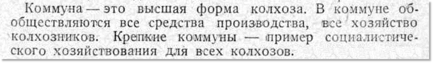 Именно к коммуне, как к высшей форме коллективного хозяйства, должны были бы в итоге прийти крестьяне. Когда все имущество, от техники и тяглового скота, до кур и поросят являются общей собственностью.