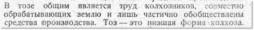 Но была еще и третья форма коллективизации, так называемые ТОЗы, товарищества по совместной обработке земли, где общим был только лишь труд членов товарищества, а вот средства производства были частными или обобществлены частично.