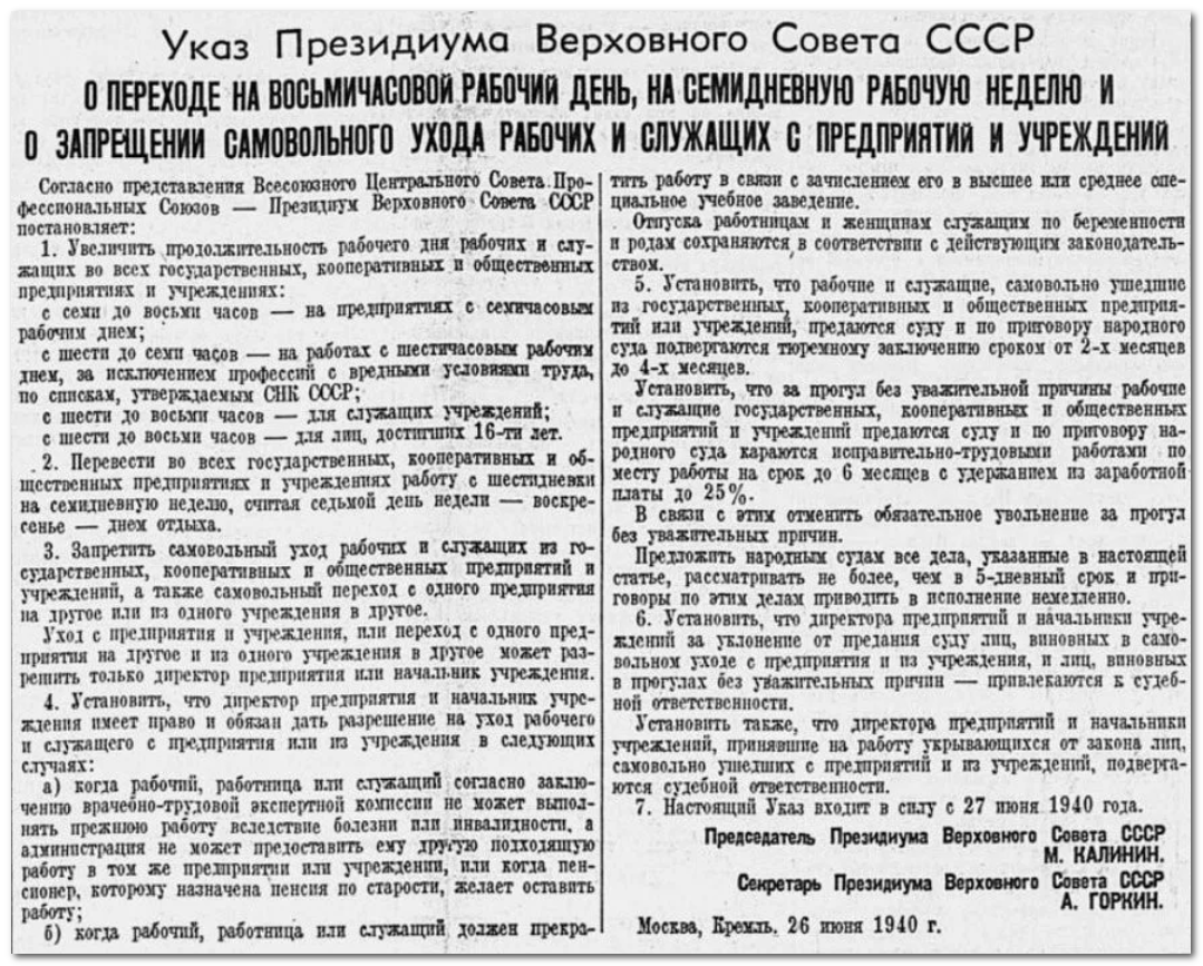 Подумаешь, всего два слова. А ведь по факту это говорит о том, что до 26 июня 1940 года, т.е. подписания этого указа, любой нерадивый рабочий завода или фабрики, мог безнаказанно не выйти на свое рабочее место.