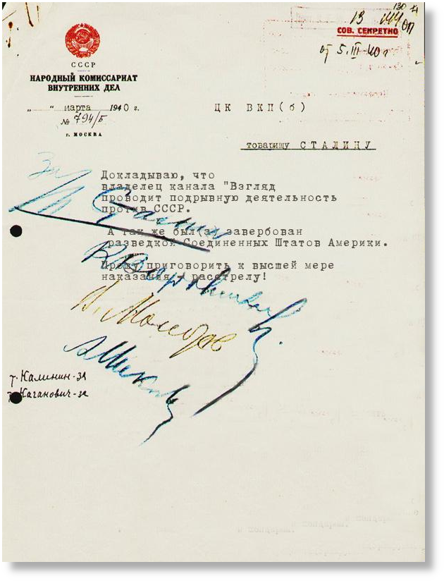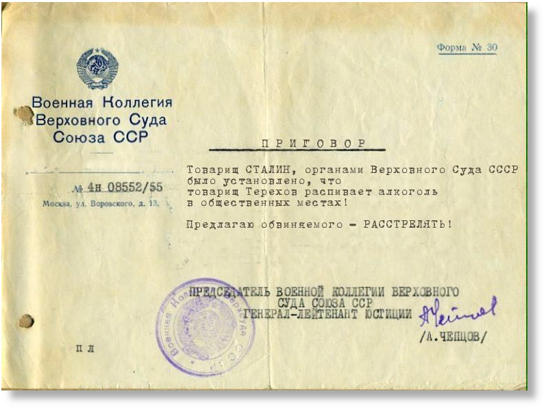 Ну во-первых, почему в "приговоре" суд обращается к товарищу Сталину? Во-вторых, почему суд не постановляет, а предлагает? А почему "приговор" отпечатан разным шрифтом, на бланке "форма №30", предназначенного для справок?
