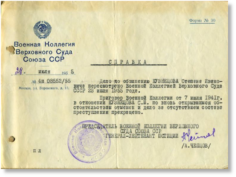 Что, собственно, соответствует форме документа, т.е. форма №30. При чем оригинальная справка сама по себе разбивает миф о беззаконии в СССР, в ней говорится об отмене ранее вынесенного приговора, по вновь открывшимся обстоятельствам.