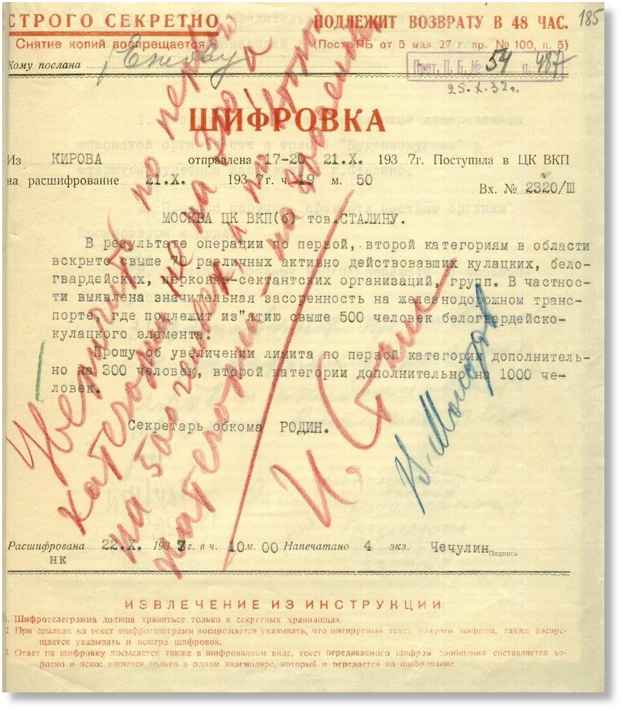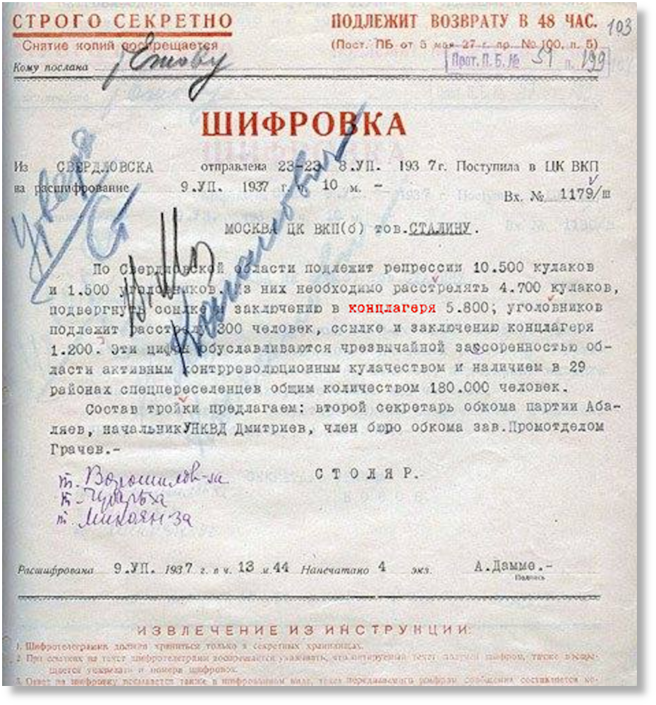 Но тем, кто поливает фекалиями нашу страну, совершенно не важно, что Сталин не мог увидеть эту шифровку, главное, по замыслу фейкоделов, что он, якобы, оставил, на документе предназначенном Ежову, свою резолюцию, и даже увеличил, с барского плеча, количество репрессируемых...