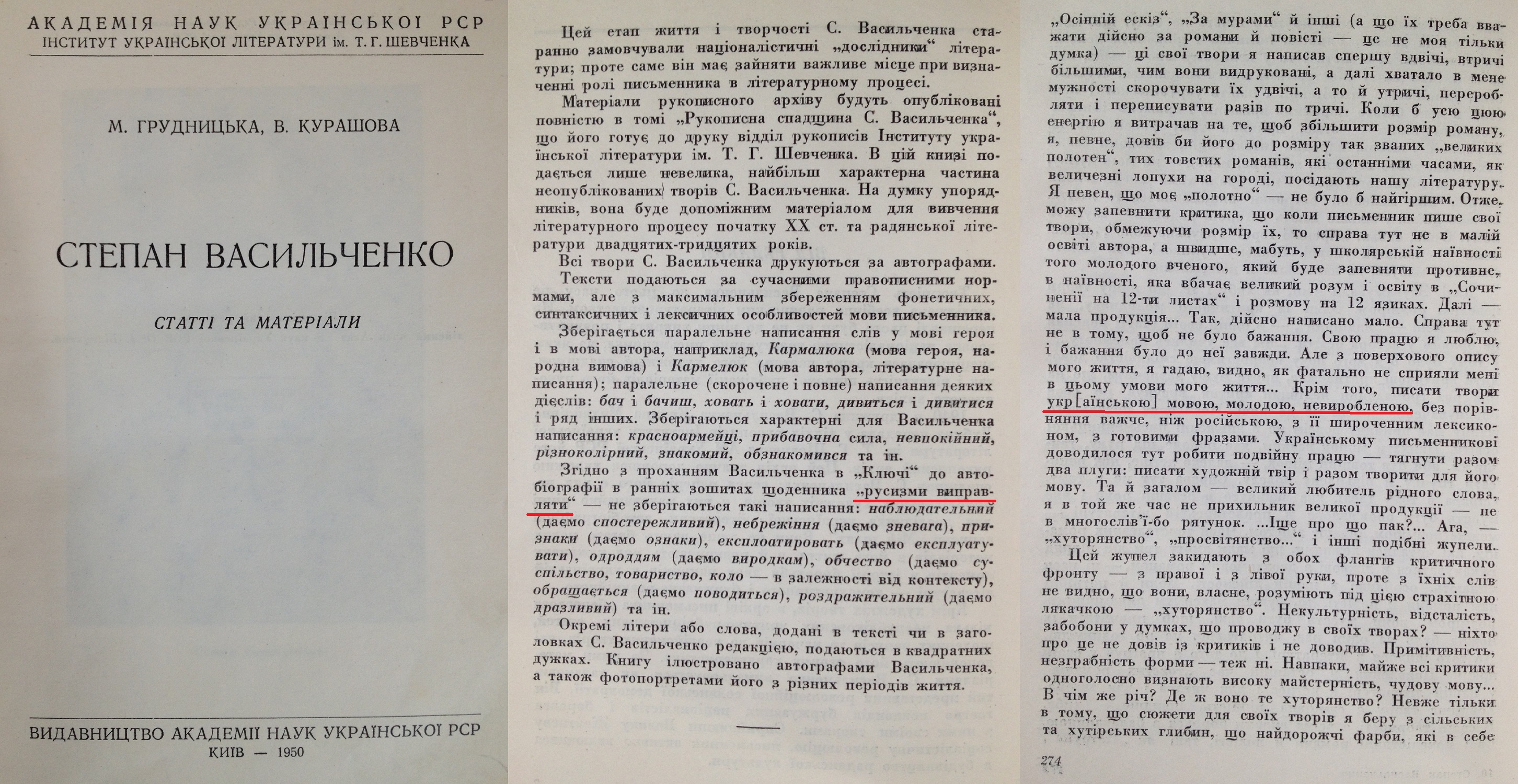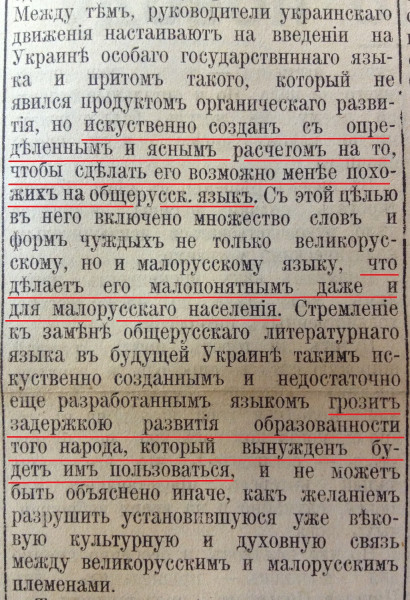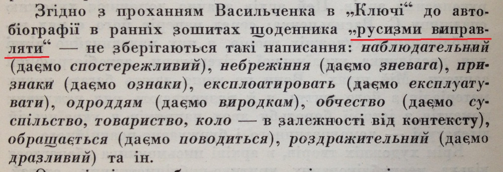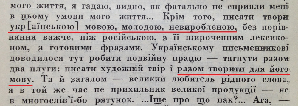 "Кроме того, писать сочинения укр[аинской] мовой, молодой, недоделанной, несравнимо тяжелее, чем русским языком, с его широчайшим лексиконом, с готовыми фразами. Украинскому писателю приходилось тут выполнять двойную работу — тянуть сразу два плуга: писать художественное сочинение и одновременно создавать для него мову"