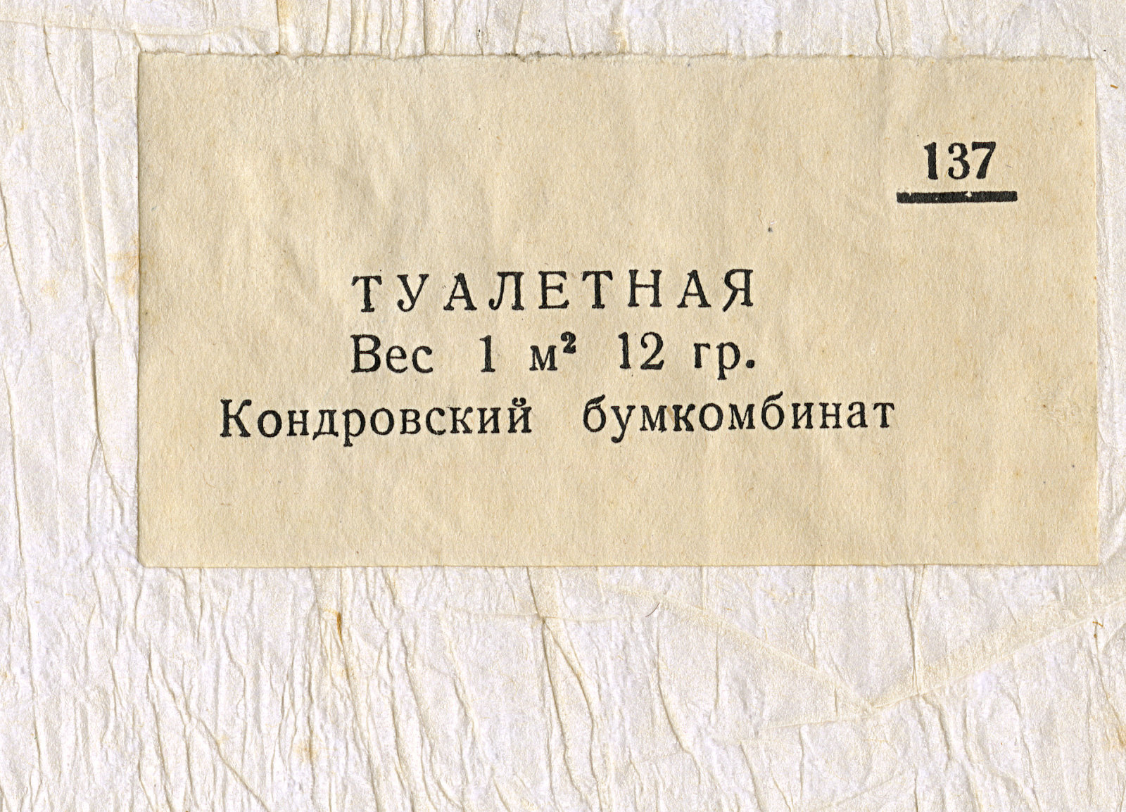 «Бумага туалетная вырабатывается из неклееной бумаги и выпускается в пачках весом 250 г, скрепленных бандеролью или связанных в одном из углов бумажным шнуром для подвешивания. Вес Б.т. 30–50 г/м2, формат (в мм) 130 х 135, цвет естественного небеленого волокна. <…> Вырабатывается также крепированной, в рулончиках, приспособленных к отрыванию куска бумаги определенной длины»
