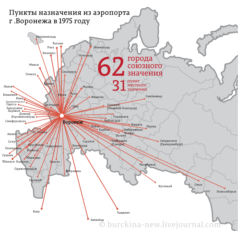 Из Воронежа в 1975 году можно было напрямую улететь в 62 города союзного значения: от Калининграда на западе до Новосибирска на востоке. Плюс можно было попасть в 31 населенный пункт местного значения. С тех пор прошло 40 лет. Смотрим, куда из Воронежа можно напрямую улететь в России ХХI века: