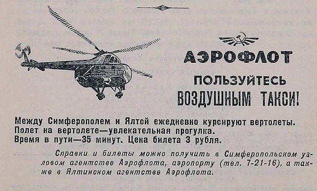 -- Местная малая авиация в самом буквальном смысле сшивала страну воедино. "Ан-2" возил на 300-400 км за очень даже смешные деньги, вполне сопоставимые с поездкой на такси по Москве. (Стоимости билетов не помню, так что называть суммы воздержусь). См., в частности, фильм "Мимино"; то, что до поездки в Москву - чистая правда.