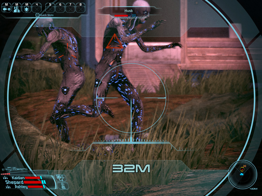 Особенно понятно это на снайперках -- они нормально работали лишь когда в самом конце геты десантировались с корабля, и их надо было отстреливать издали. Они тогда в принципе не попадали, и можно было просто стоять и не спеша их отстреливать. Эшли тогда из снайперки тоже несколько гетов сняла. Обычно же снайперкой надо работать методом "осторожно высунулся -- стрельнул -- спрятался -- повторить", а так непись не сделает и словит какую-нибудь ракету. Когда издали на планетах пушки таки образом расстреливал и танки шагающие, пытался неписям тоже снайперки дать -- ща, они стоят как дебилы герои в полный рост и реагируют на ракеты, только когда они по ним попадают -- помирают тут же.
